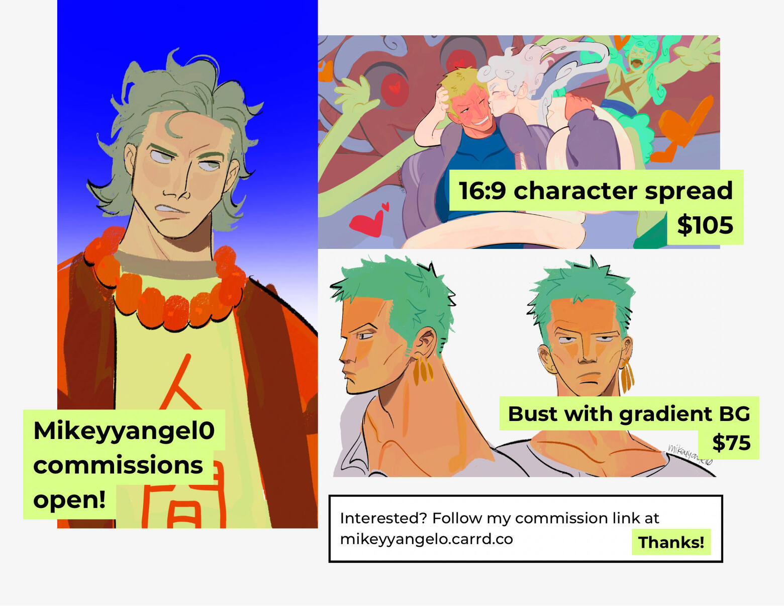 Feel free to tag me my socials when posting your commission: Twitter: @mikeyyangel0, Tumblr: @mikeyangel0, BlueSky: @mikeyangelo & IG: @mikeyyangel0